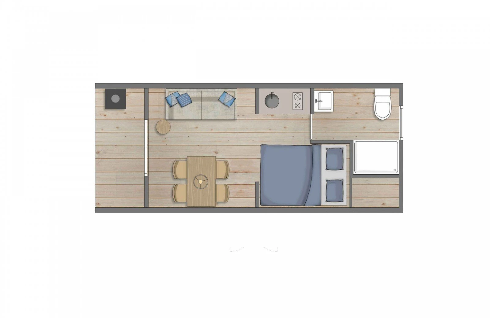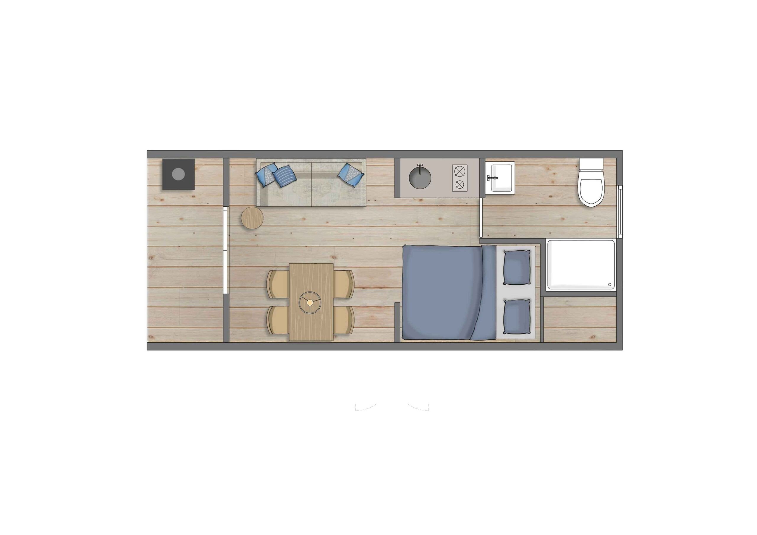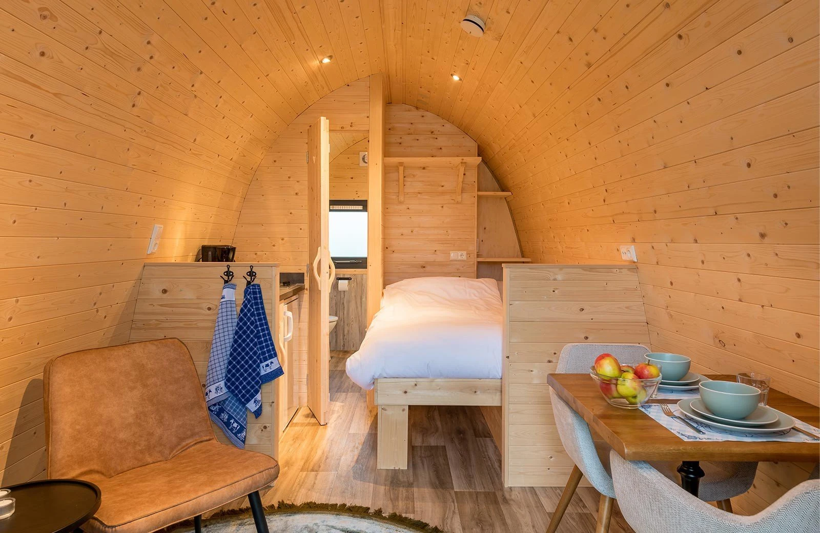 This Polderlodge has all the necessary amenities in natural simplicity: a living area with a dining area and comfortable double bed. The compact kitchen is equipped with a hob and fridge, among other things. Of course, the Polderlodge also has a bathroom with shower and toilet. All Polderlodges are Full Electric. The water in all Polderlodges is heated by means of a Boiler.