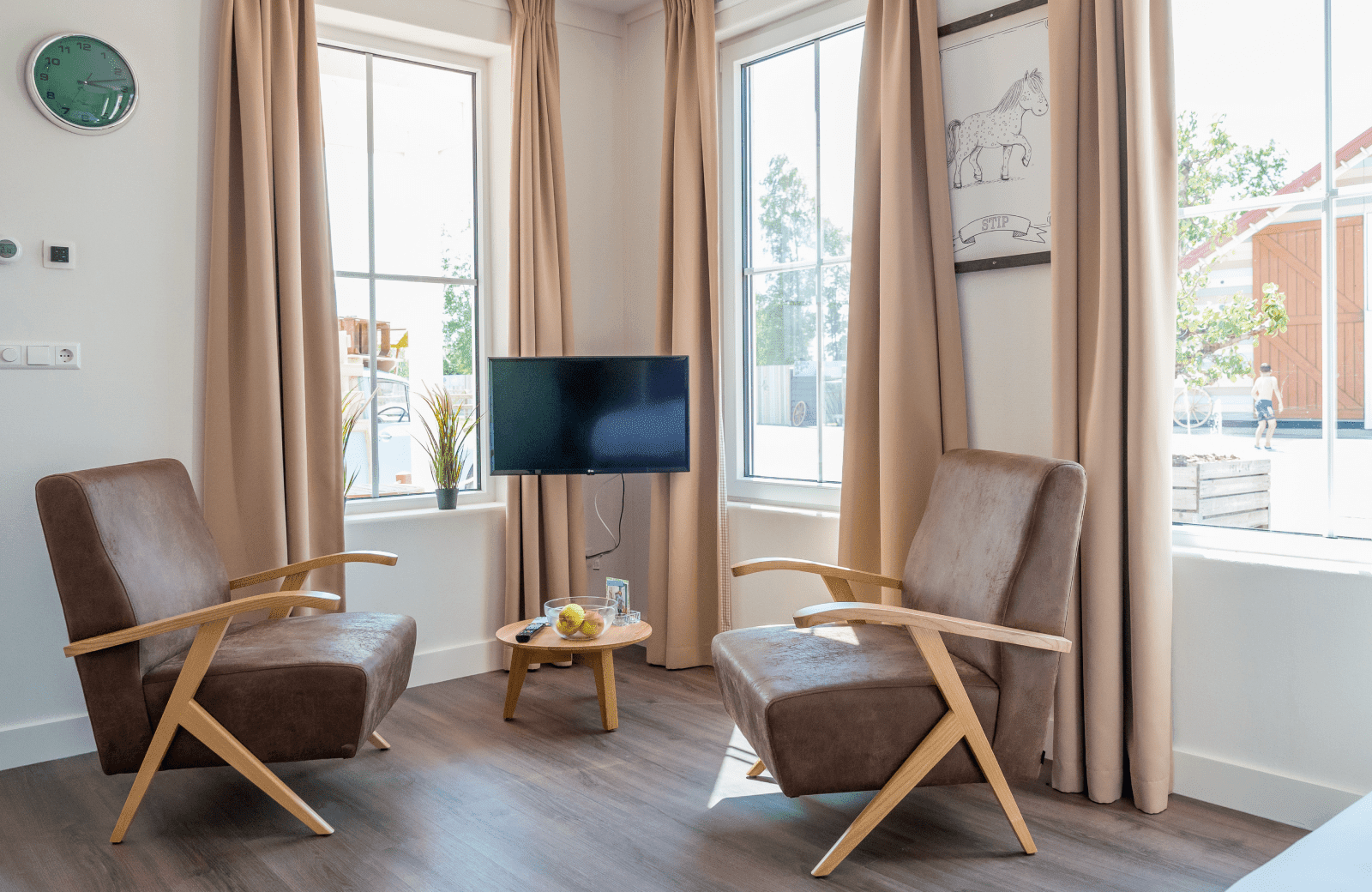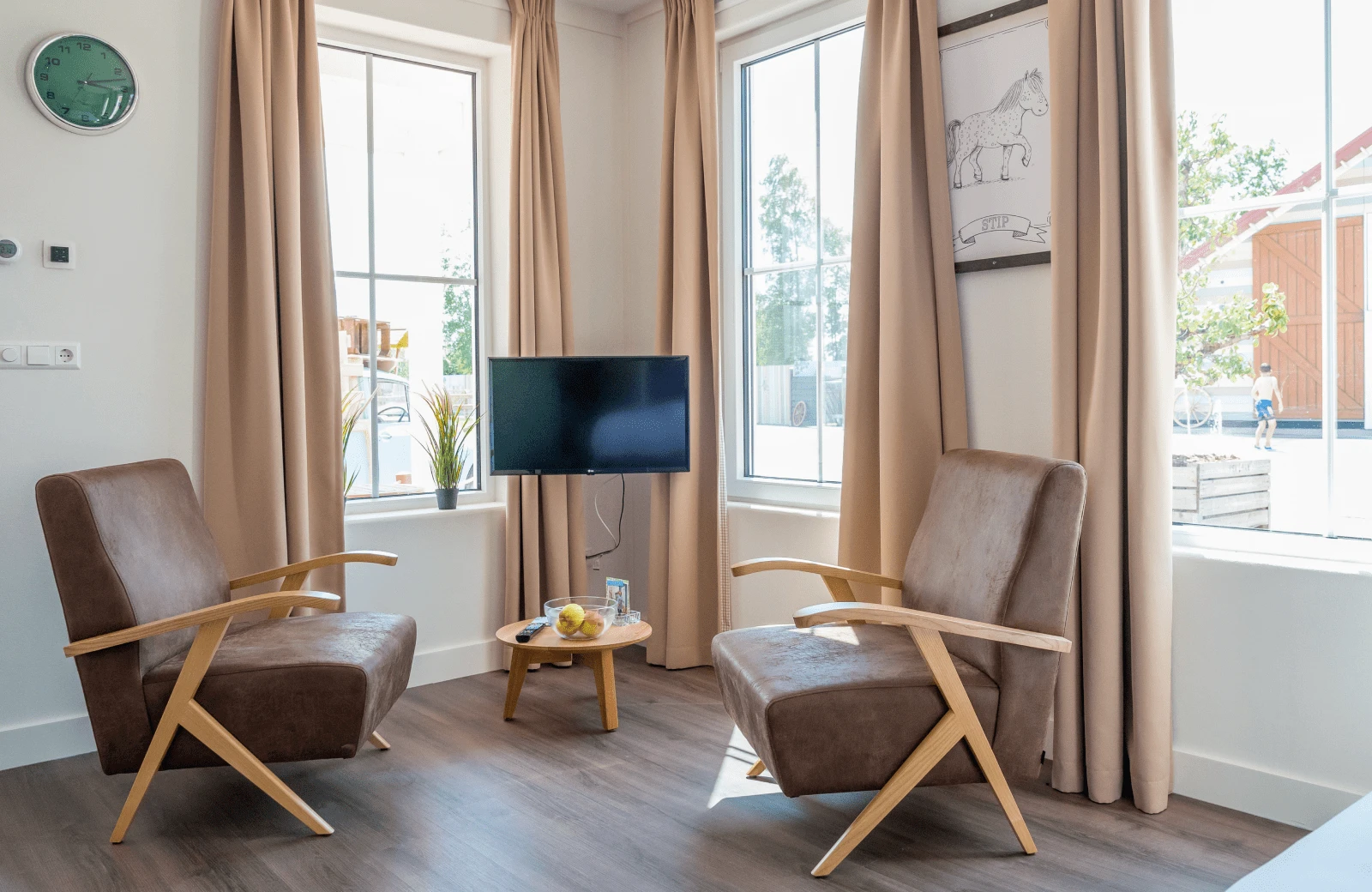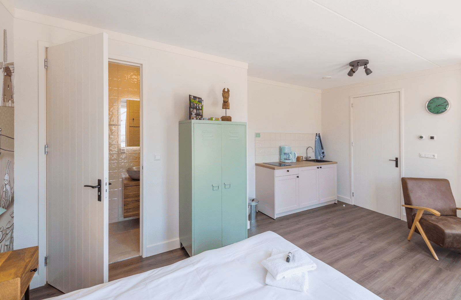 The Stip the Pony studios are located at the corners of the row of connected accommodations and have a cosy sitting area, a double box spring, a baby bed and a bathroom with shower, washbasin and toilet.