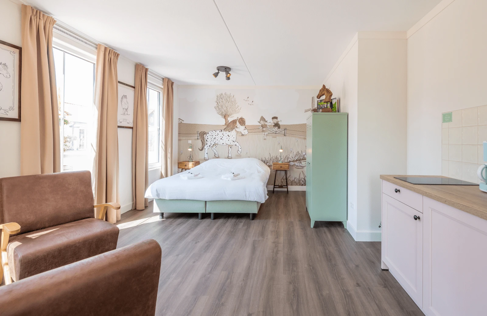 The Stip the Pony studios are part of a row of attached accommodation. The studios consist of one room and are a perfect base for a holiday with a small group. The studios are decorated entirely in Stip de Pony style. You will find all kinds of things about the mischievous Stip the Pony. These Stip de Pony studios with baby bed are located on the first floor.