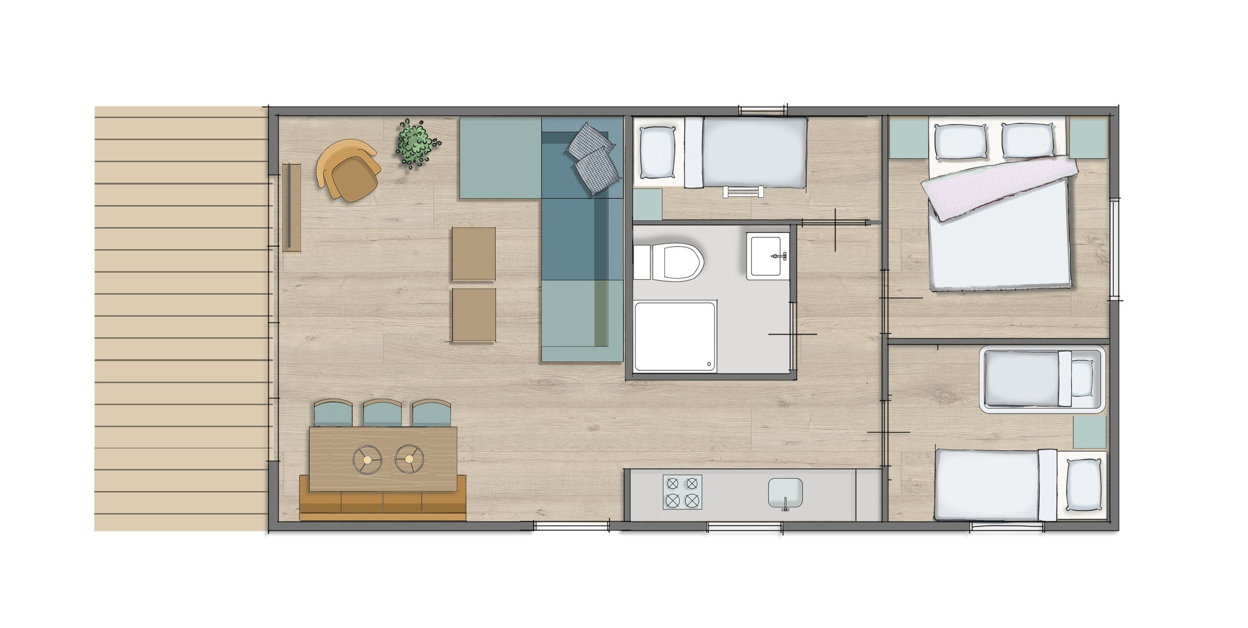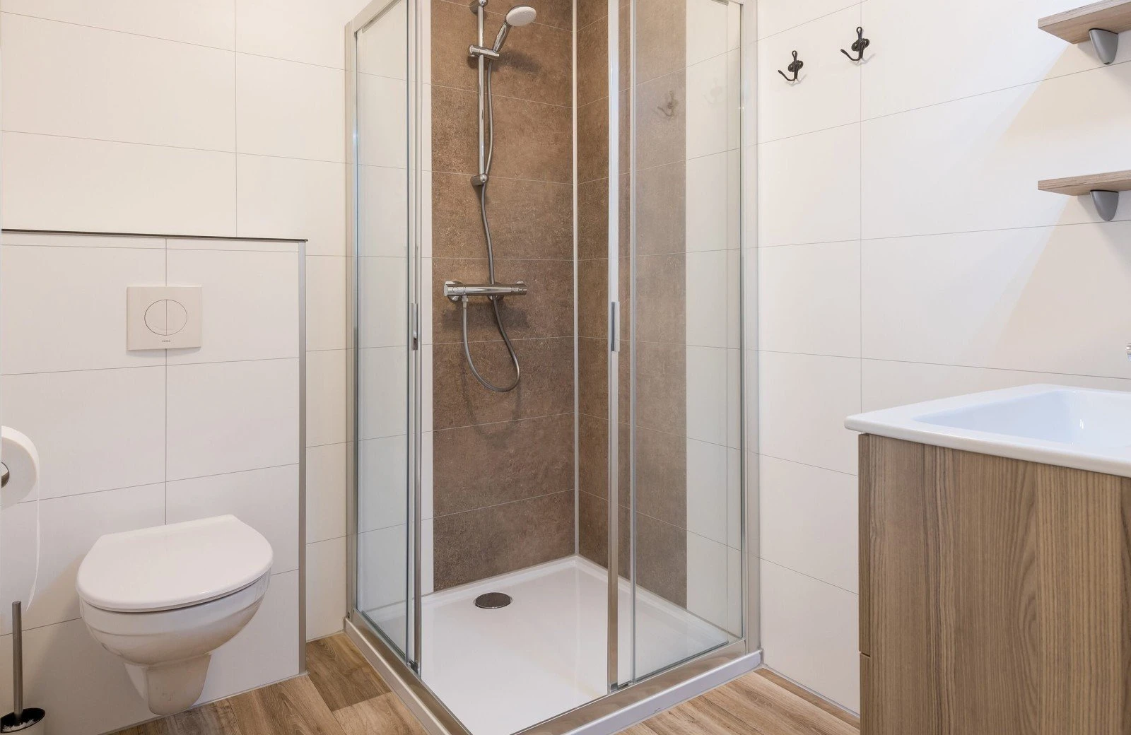 You can relax after all your adventures in one of the three spacious bedrooms. There's one bedroom with a single box spring and a baby cot, one bedroom with a double box spring, and one bedroom with a bunk bed. The adjoining bathroom features a shower and toilet, providing all the comforts you need.