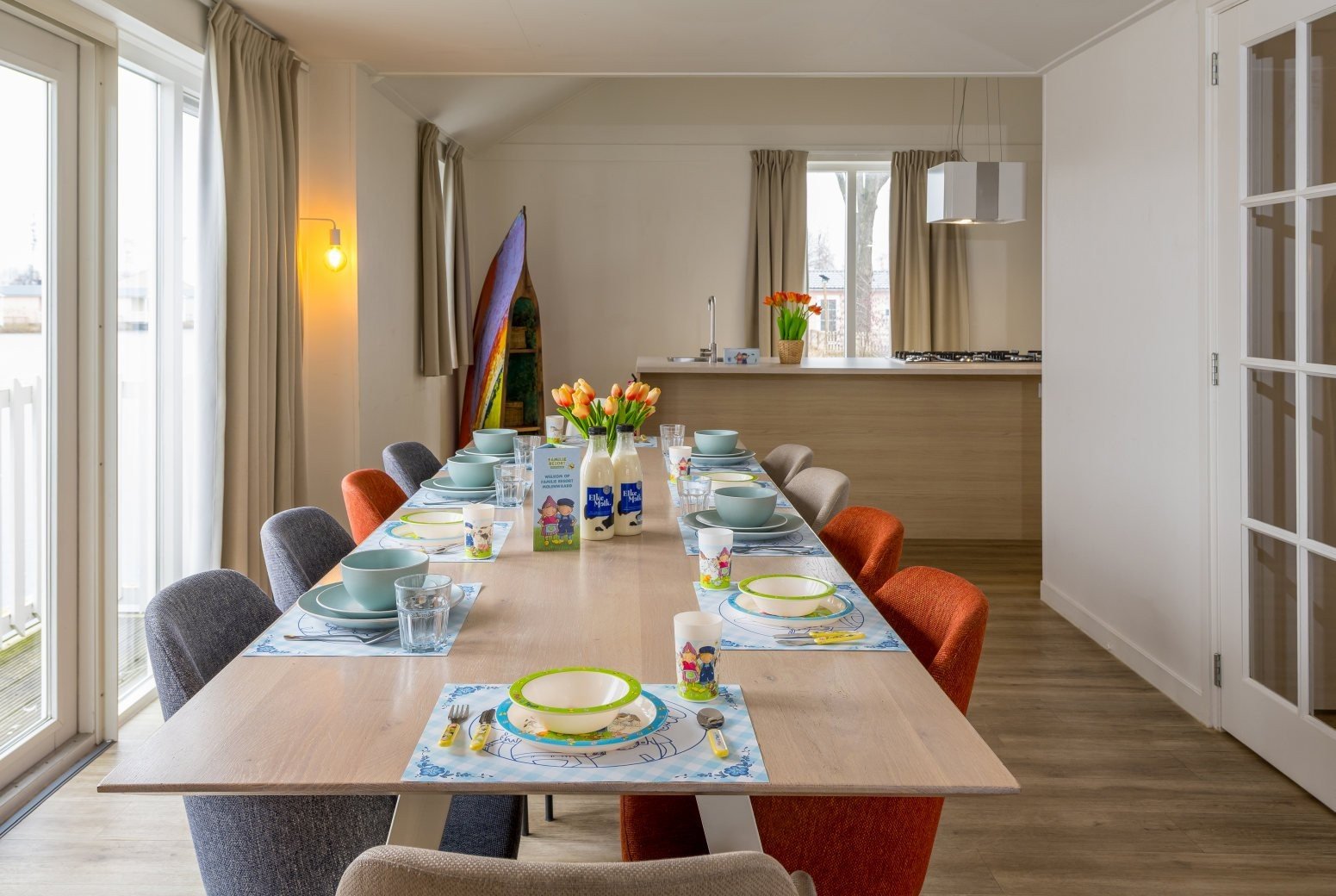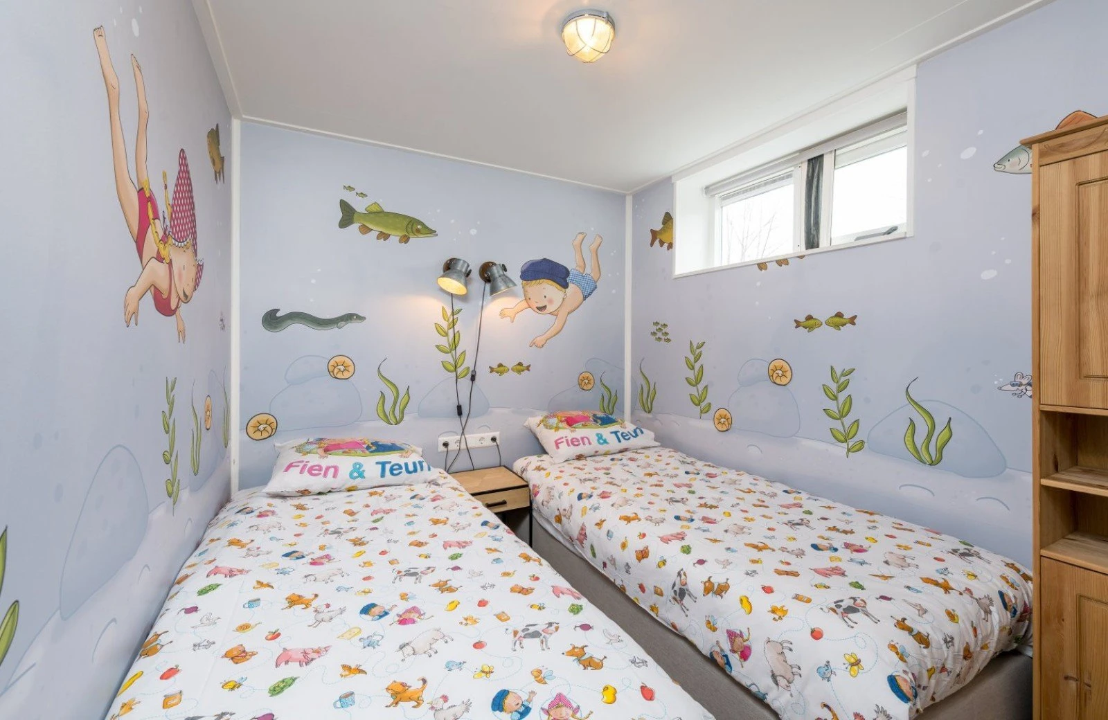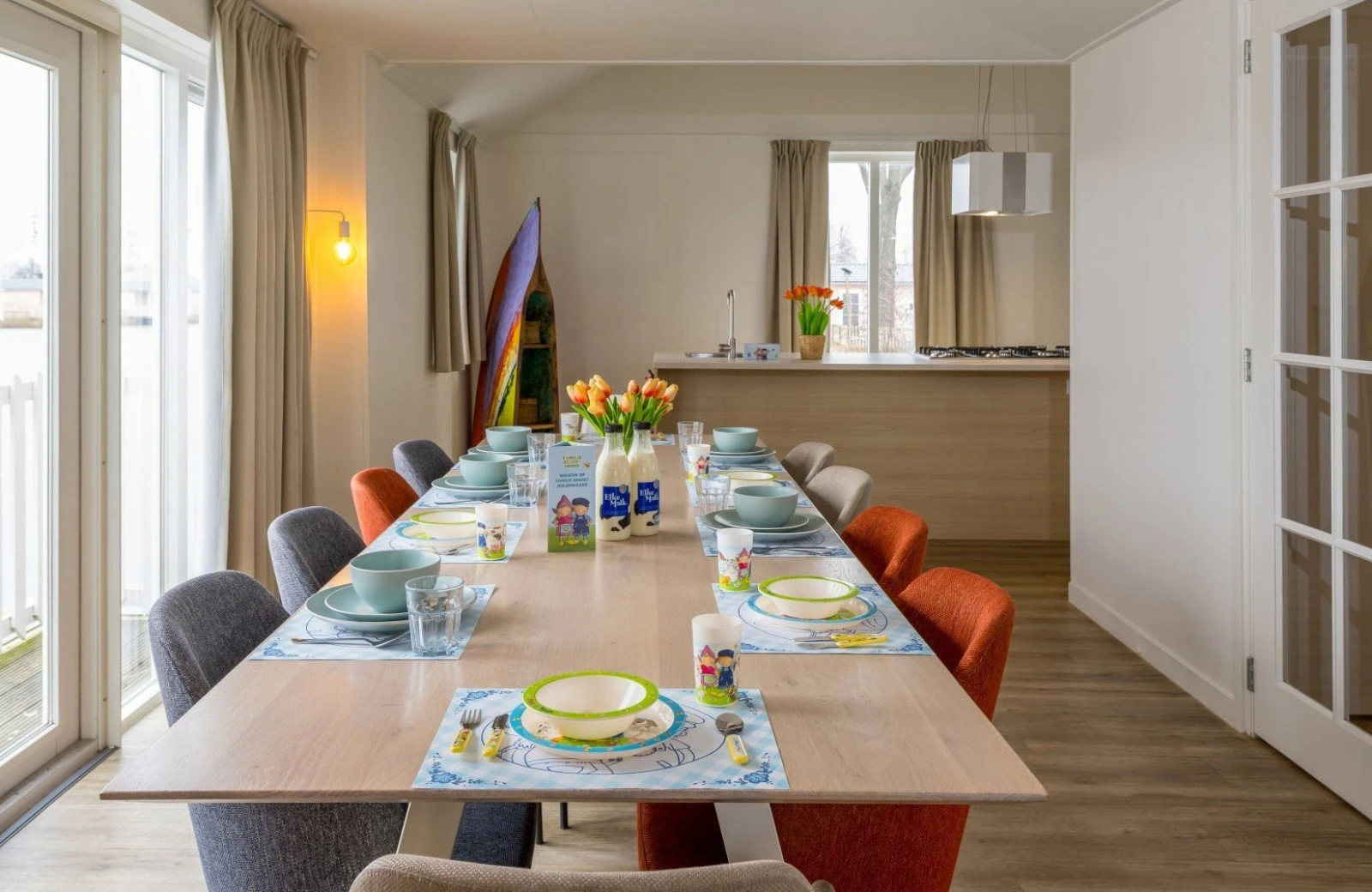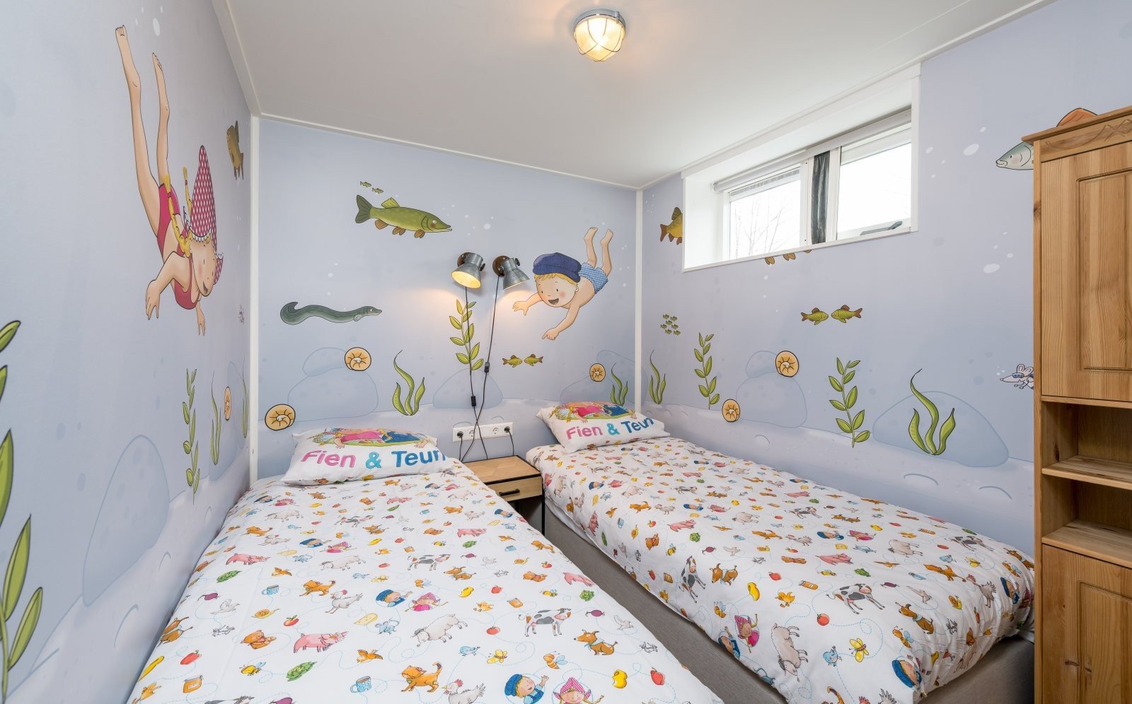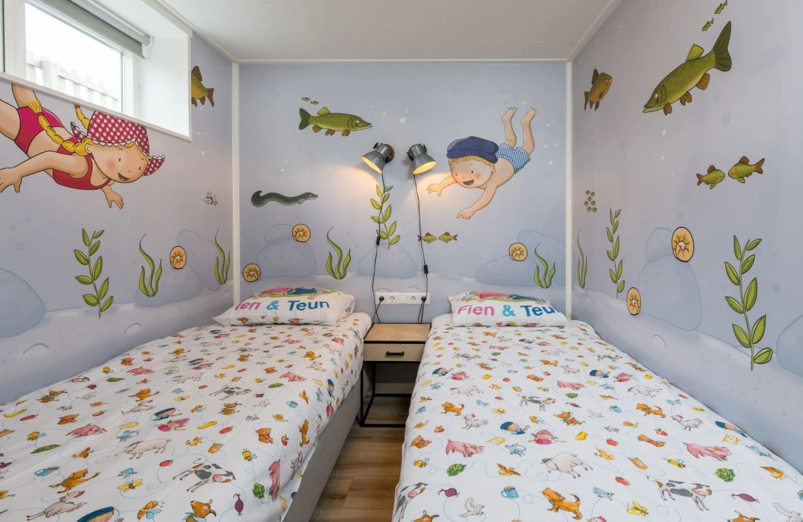 Family Resort Molenwaard has one large group accommodation floating on the gently rippling natural lake of the park. A unique place to stay! The spacious Fien & Teun Skipper’s Villa is suitable for 10 people, has 3 floors, and is fully themed in the style of the beloved farmer and farm girl, Fien and Teun.