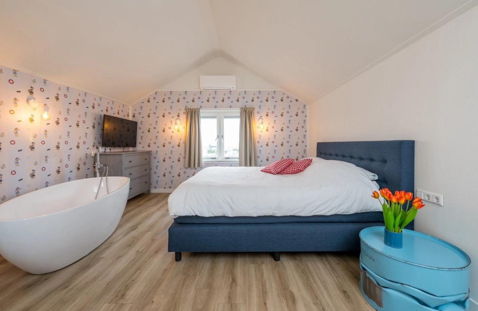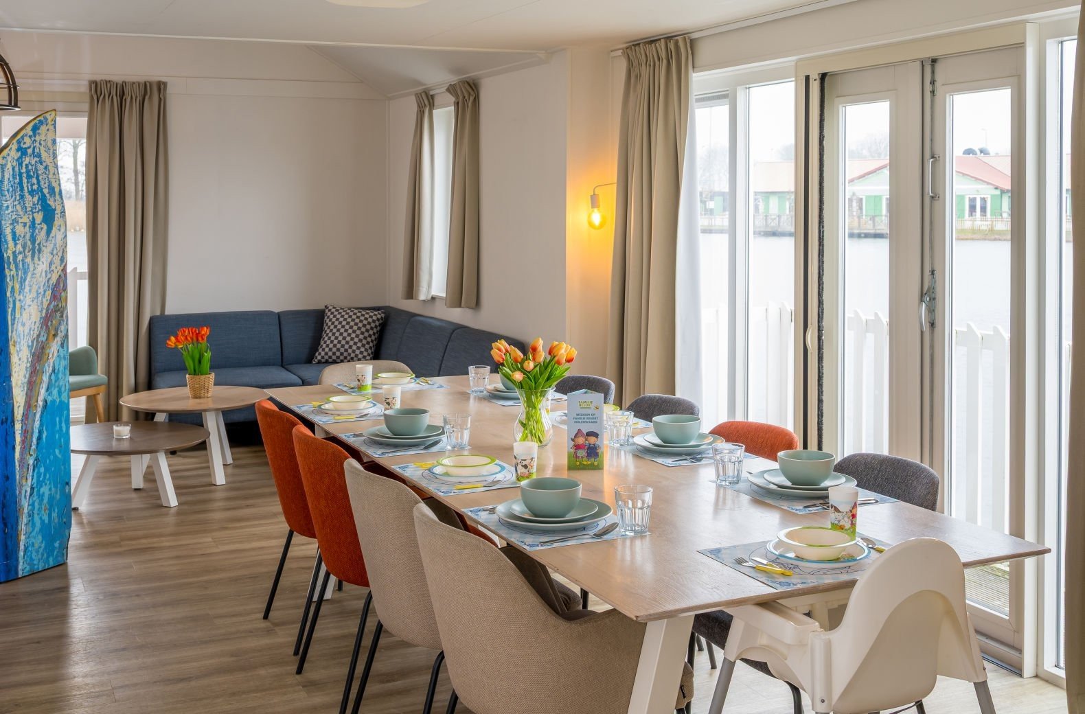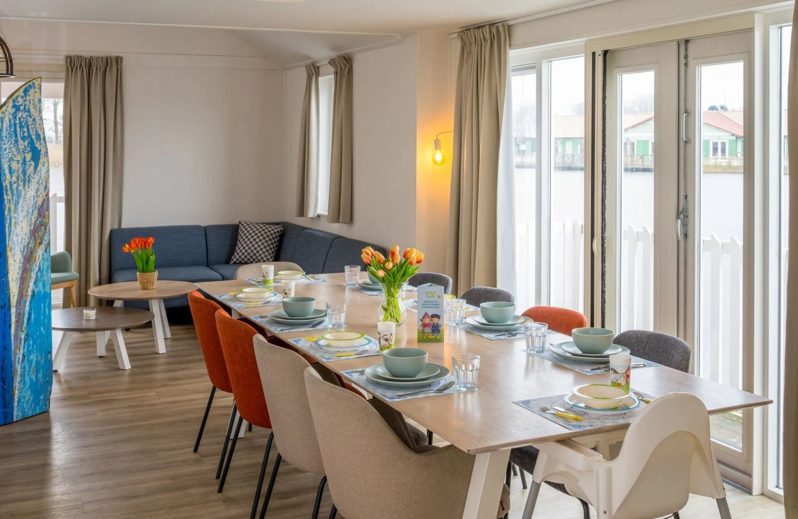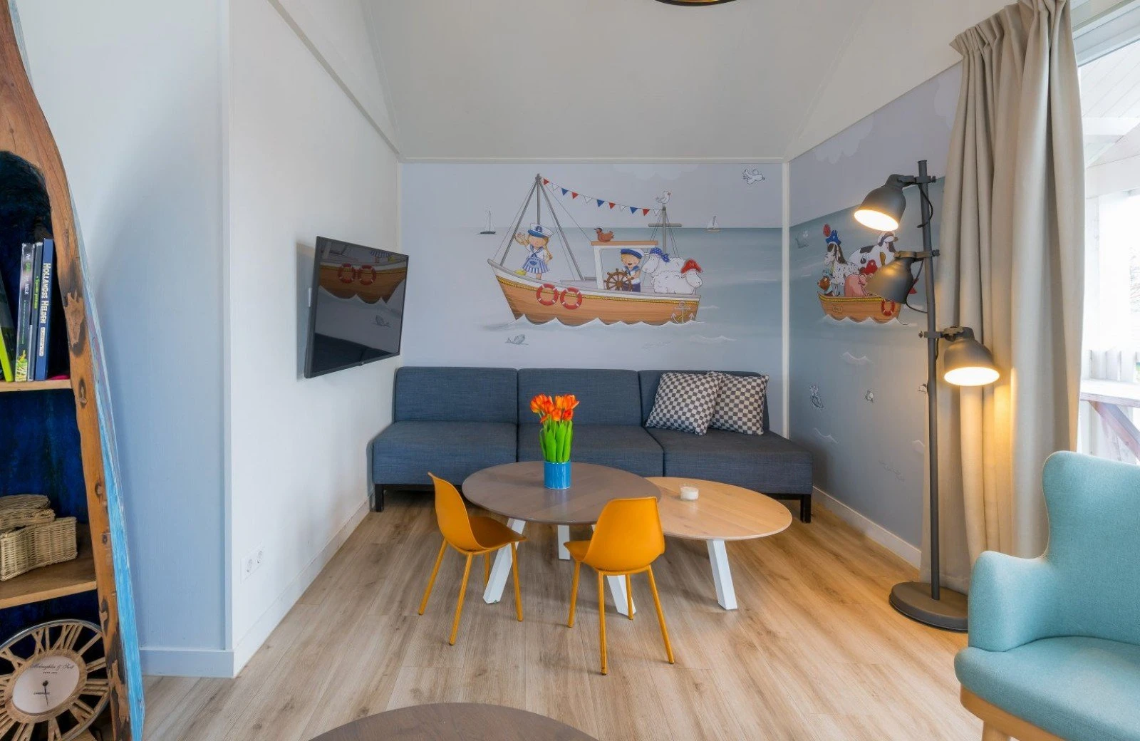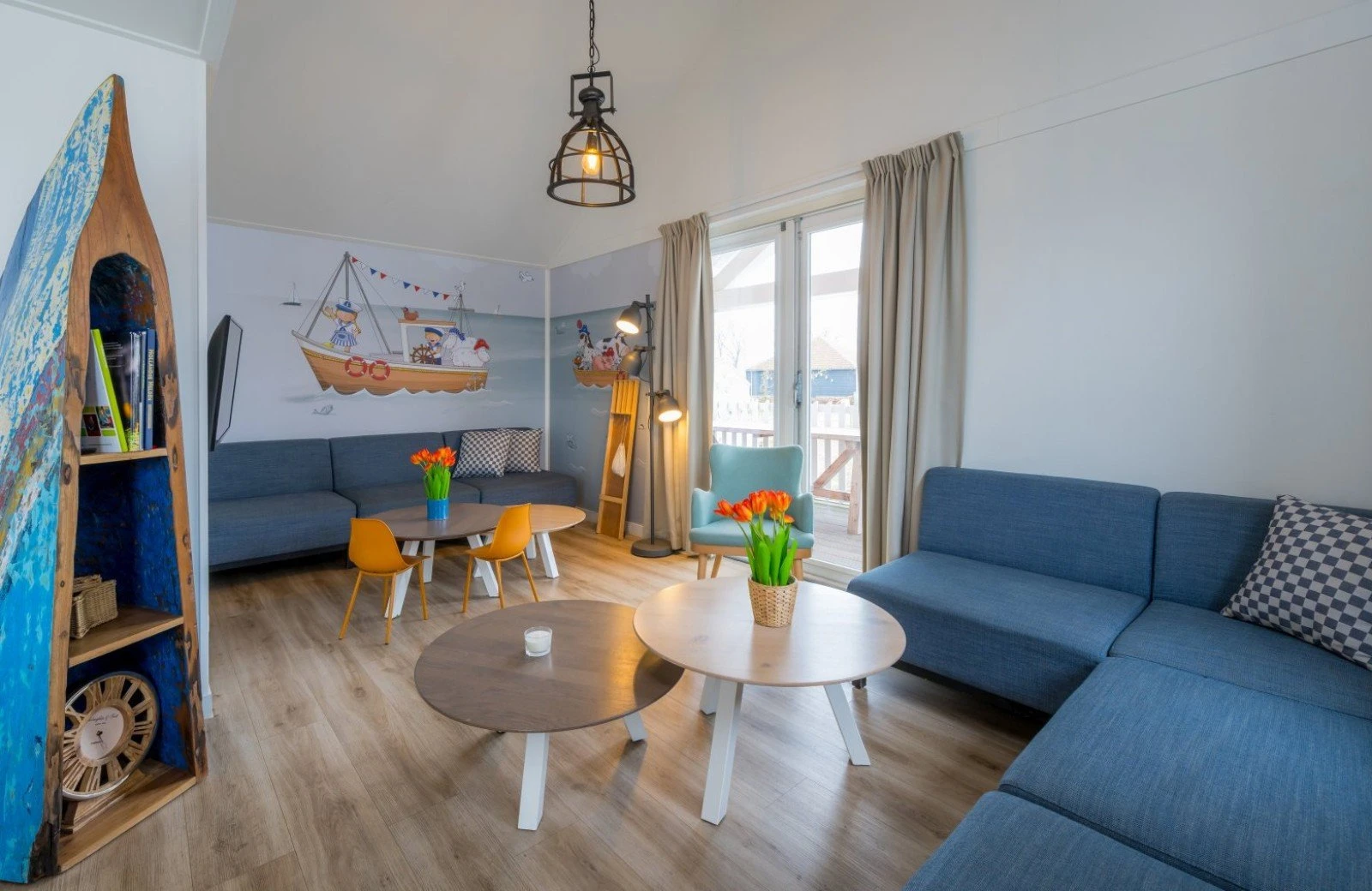 Family Resort Molenwaard has one large group accommodation floating on the gently rippling natural lake of the park. A unique place to stay! The spacious Fien & Teun Skipper’s Villa is suitable for 10 people, has 3 floors, and is fully themed in the style of the beloved farmer and farm girl, Fien and Teun.