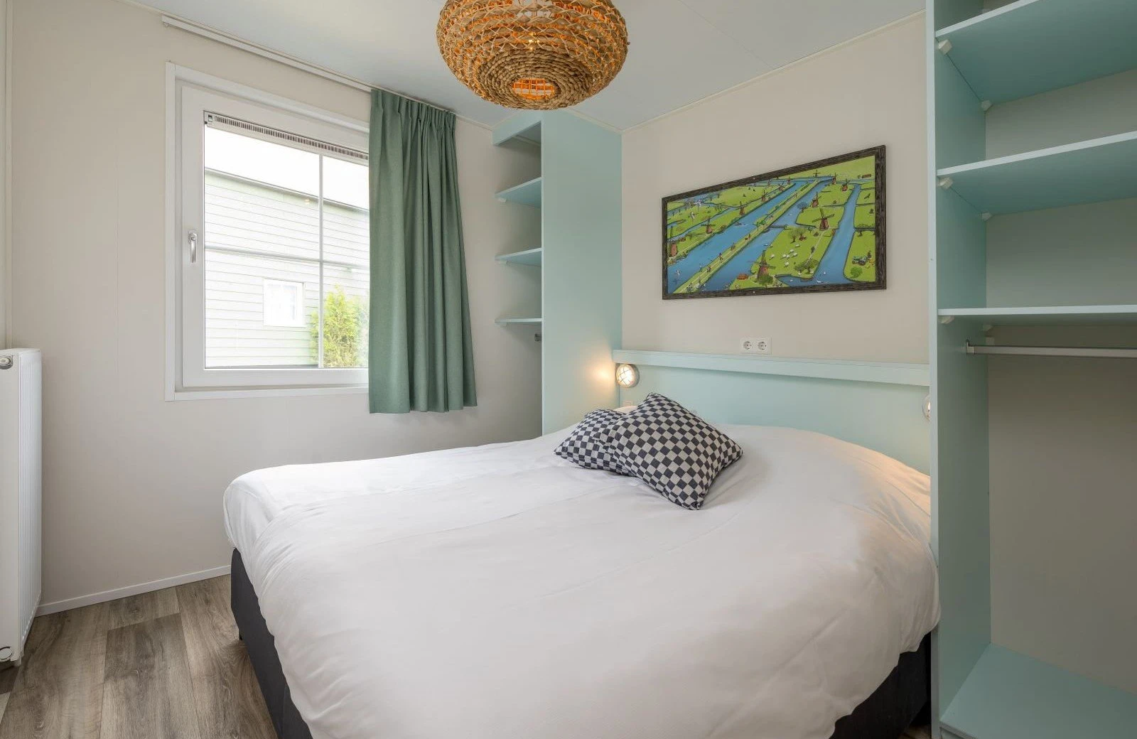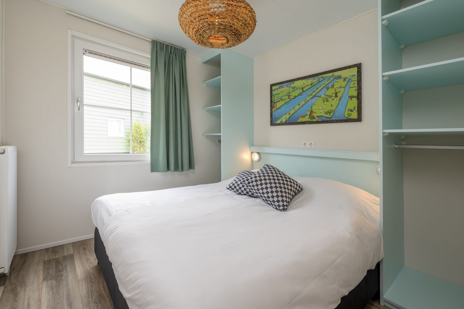 This pastel-coloured, detached Kinderdijk Cottage features a cosy living room with seating and dining area. The kitchen includes a hob, fridge, dishwasher and combination microwave. Find your way to dreamland in one bedroom with two single boxsprings and one bedroom with a double boxspring. Kinderdijk Cottage also has a bathroom with shower and toilet.