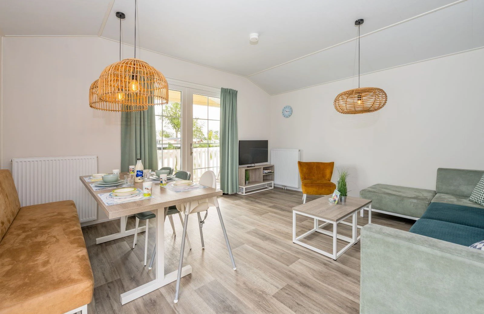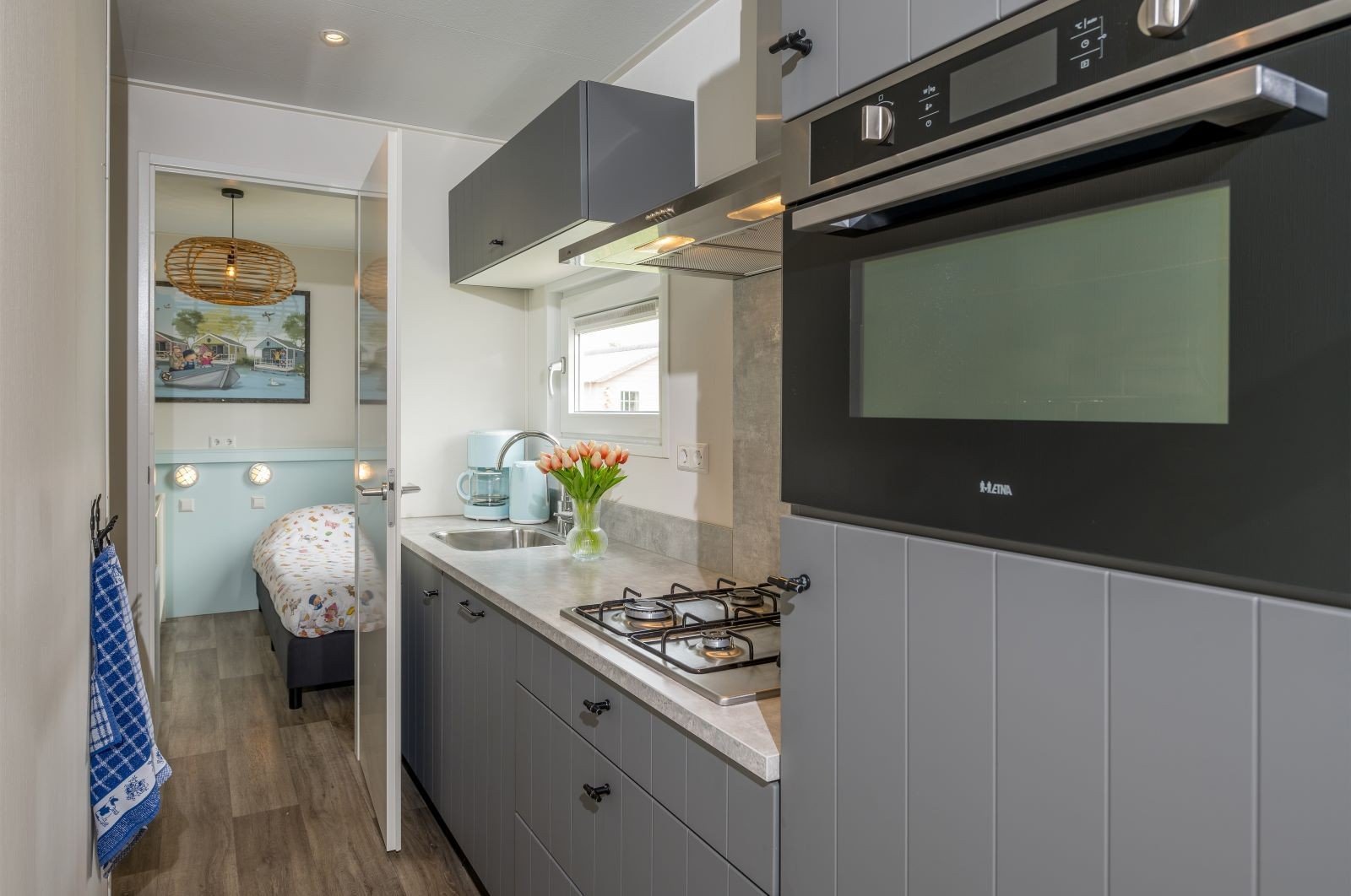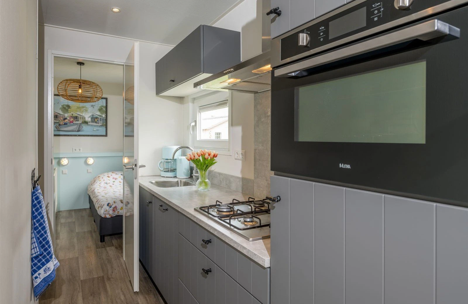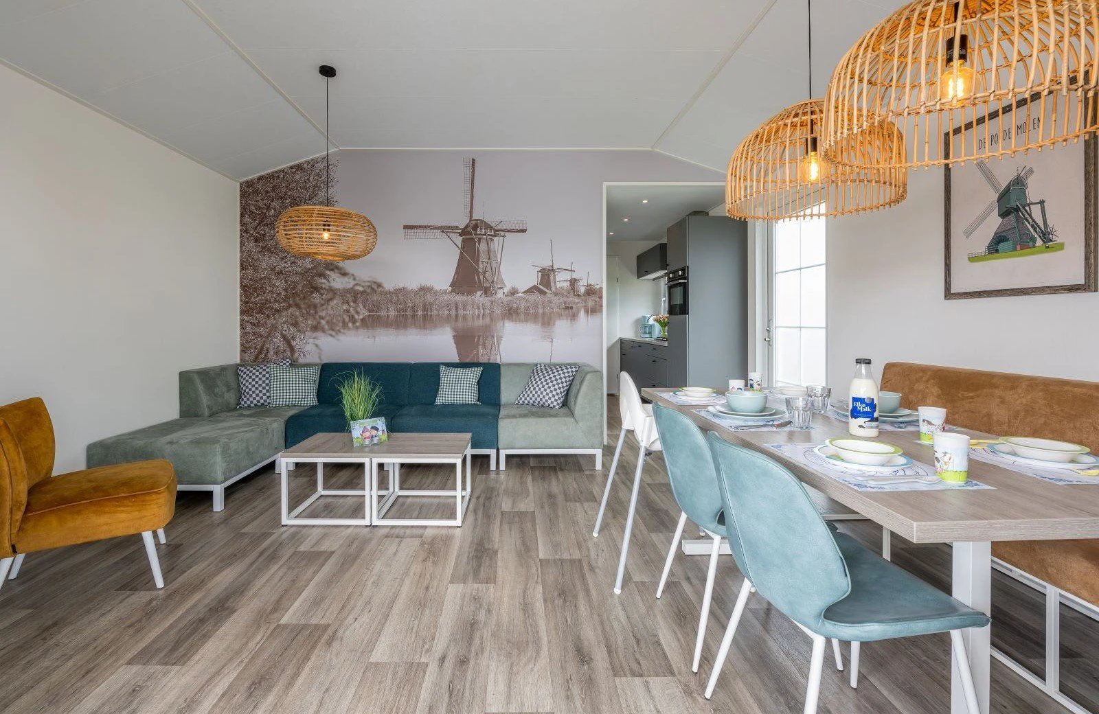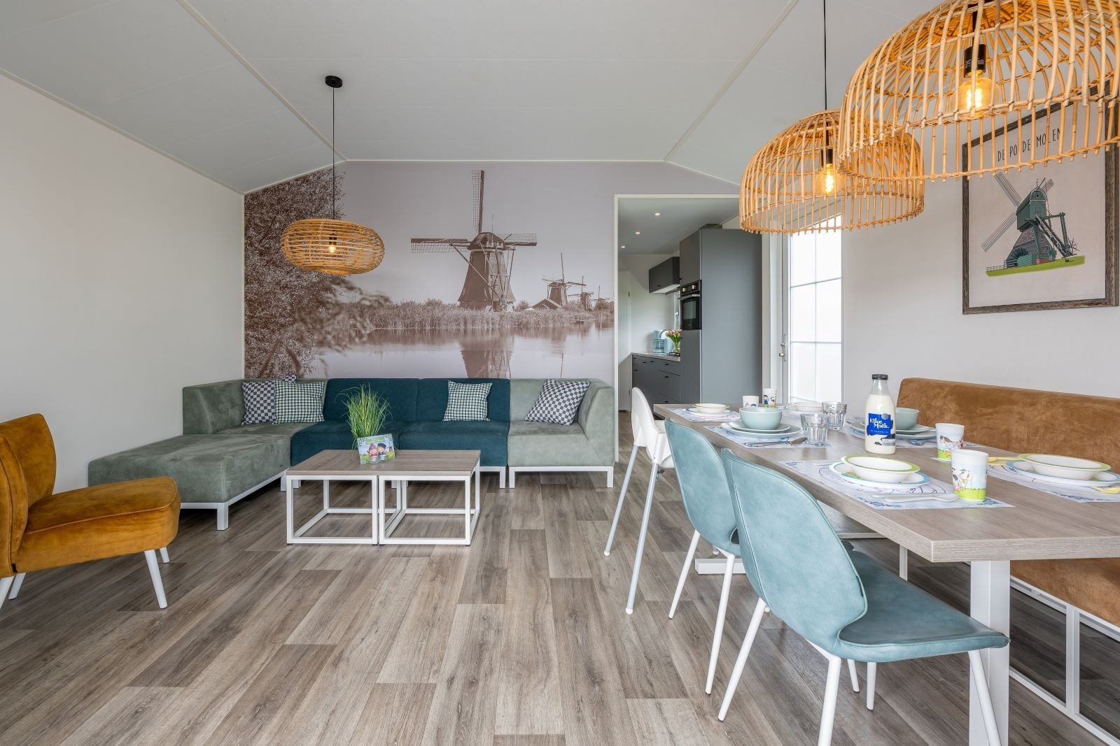 Deze pastelkleurige, vrijstaande Kinderdijk Cottage beschikt over een sfeervolle woonkamer met zit- en eethoek. De keuken is voorzien van onder andere een kookplaat, koelkast, vaatwasser en magnetron.
