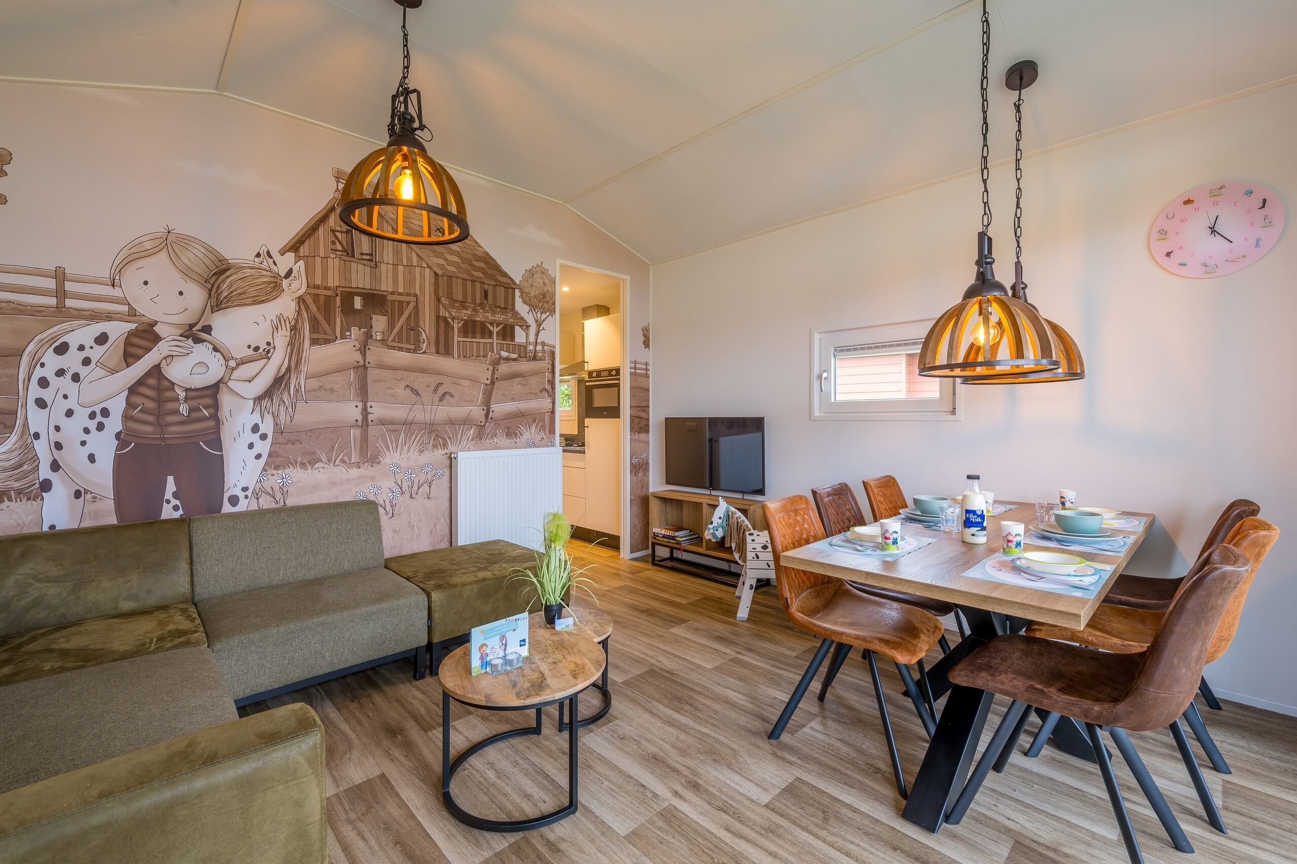 The detached Stip de Pony Lodges are fully themed in the style of Stip de Pony. You'll find everything here about this playful animal friend of Fien and Teun. Furthermore, the accommodation features a cozy living room with a seating and dining area. The kitchen is equipped with a hob, coffee maker, kettle, refrigerator, dishwasher, and microwave oven.