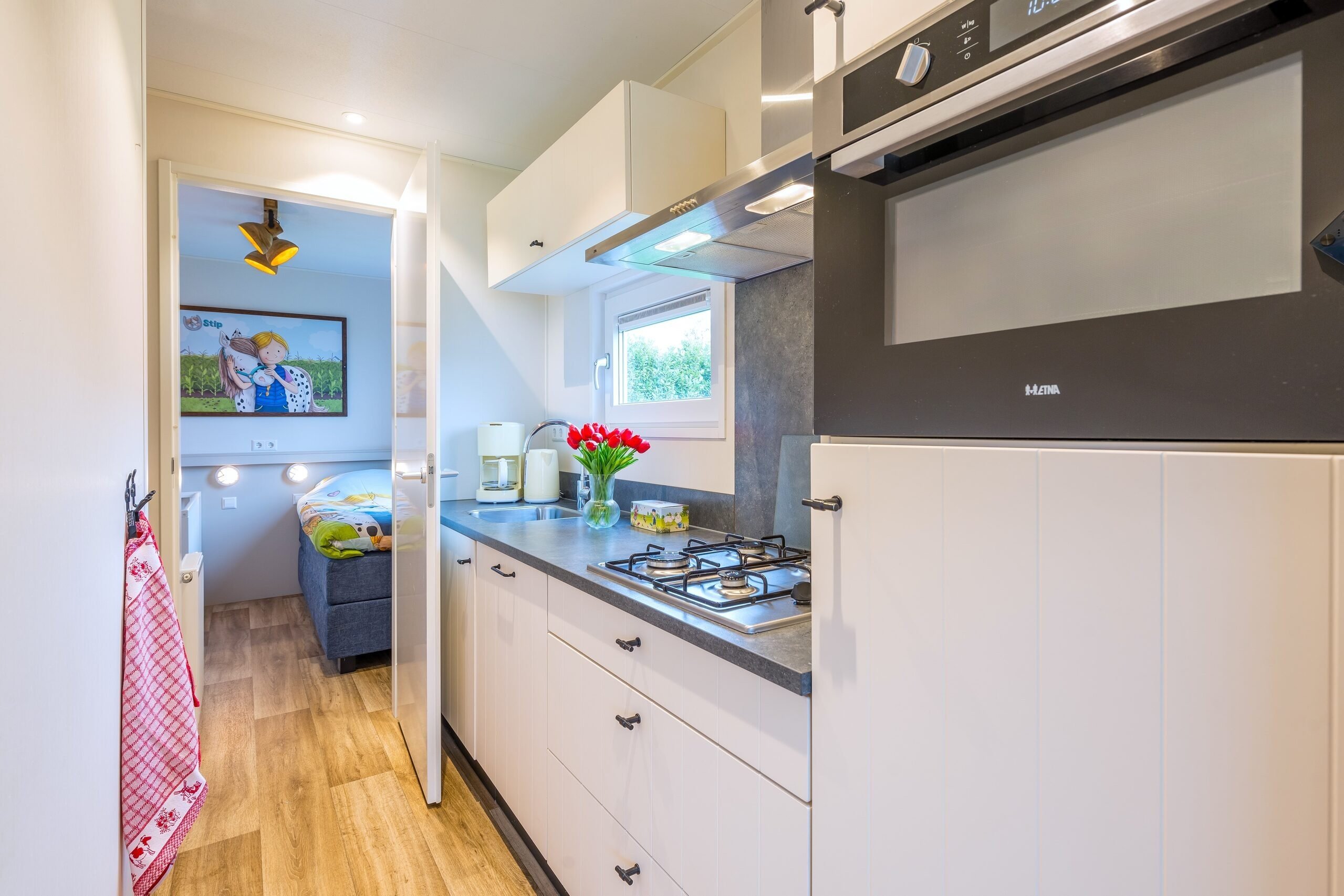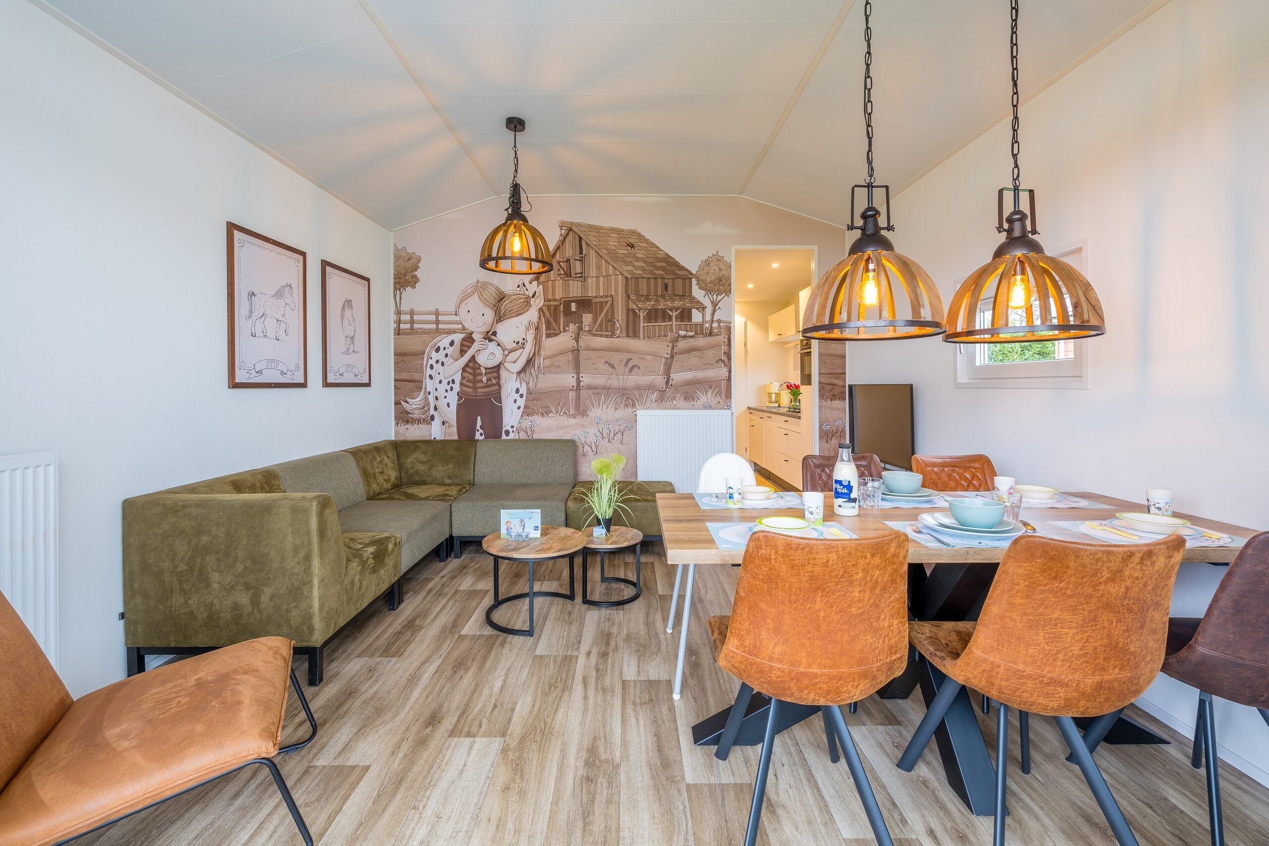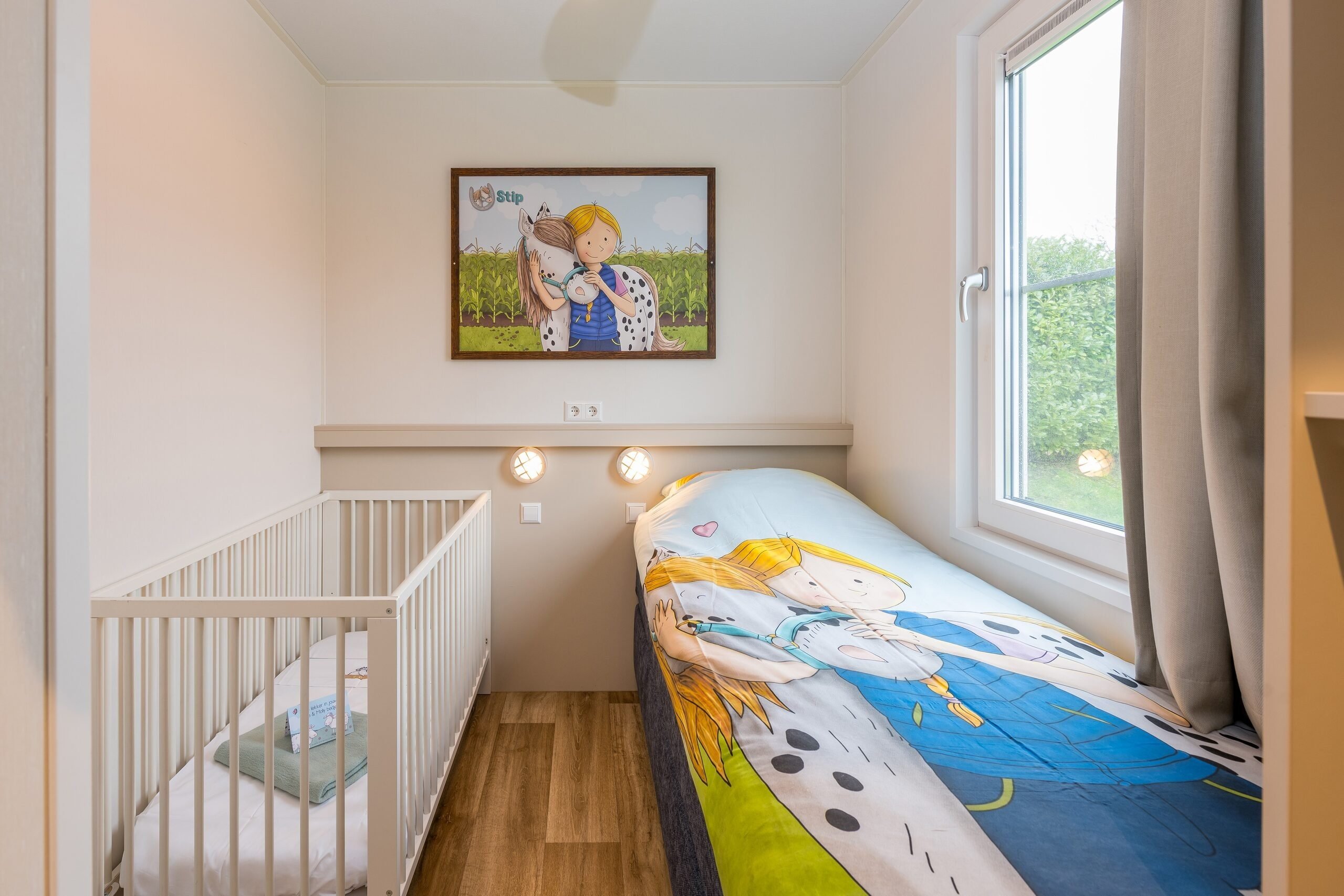 The detached Stip de Pony Lodges are fully themed in the style of Stip de Pony. You'll find everything here about this playful animal friend of Fien and Teun. Furthermore, the accommodation features a cozy living room with a seating and dining area. The kitchen is equipped with a hob, coffee maker, kettle, refrigerator, dishwasher, and microwave oven.