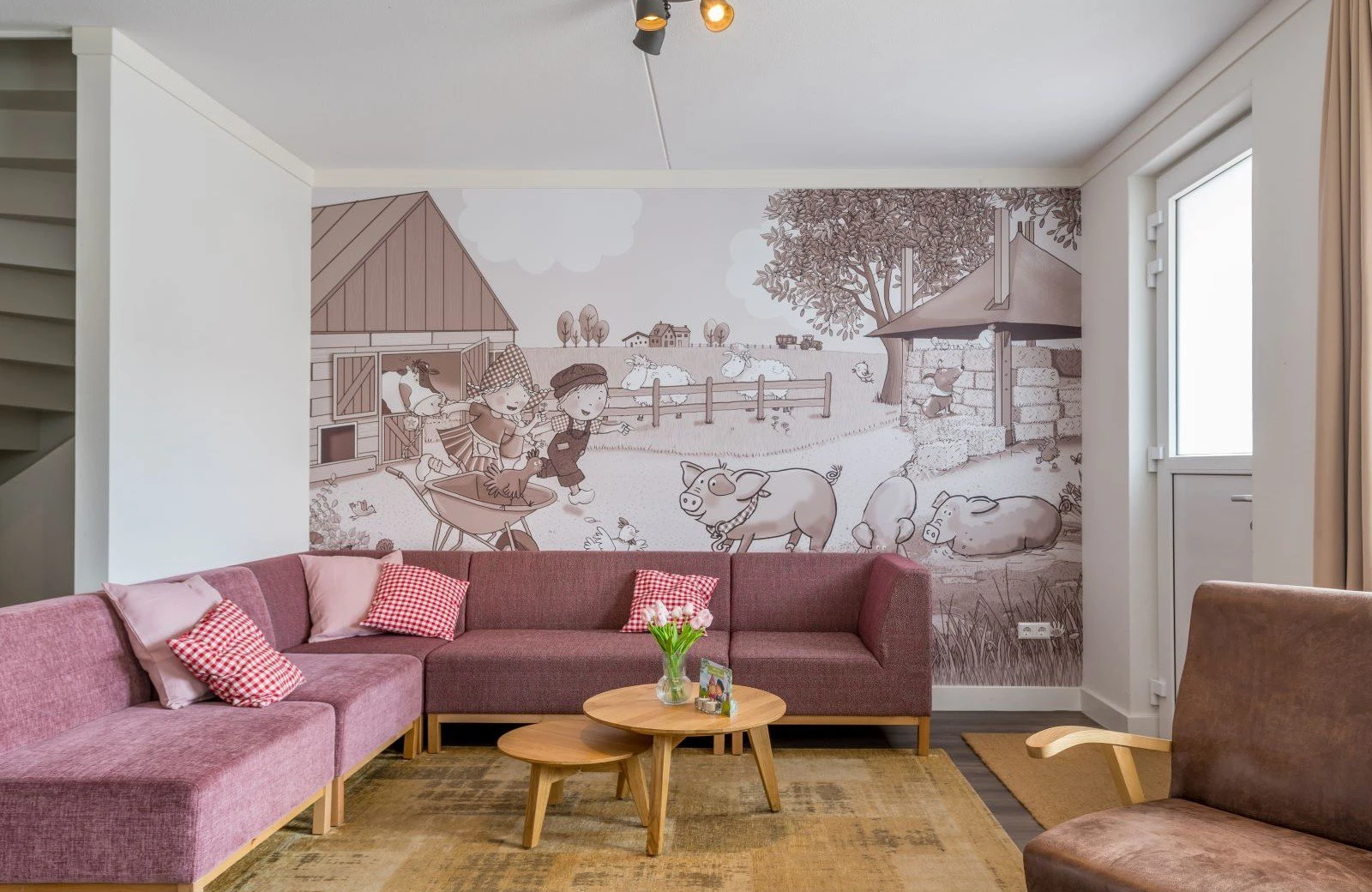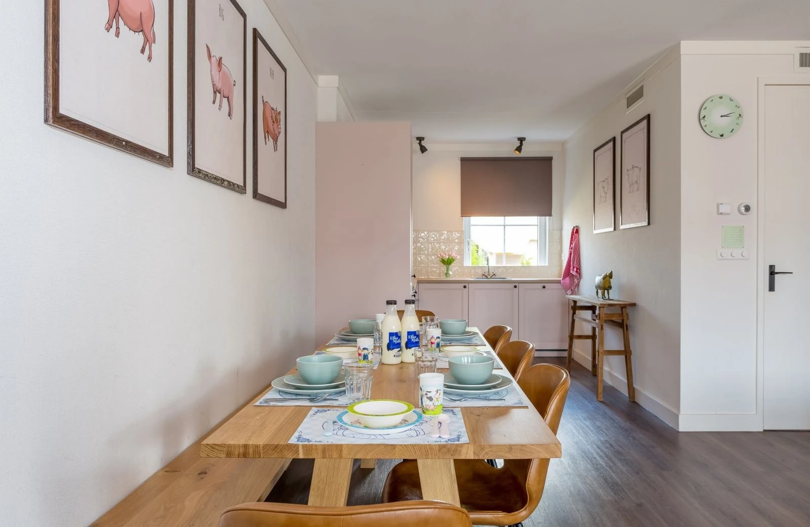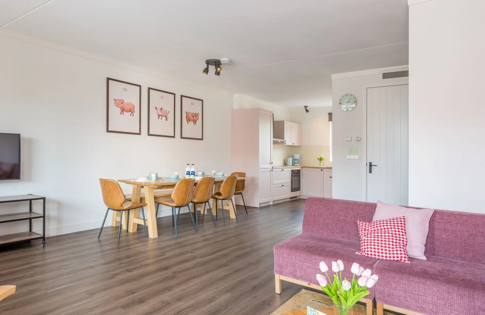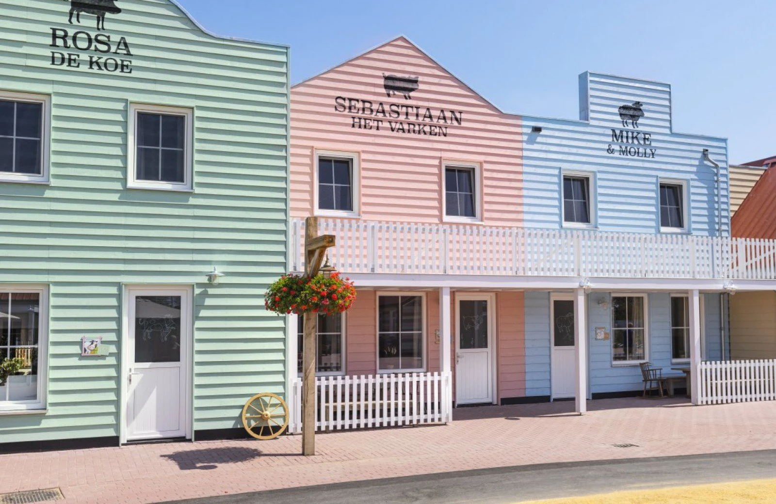 This accommodation is part of a row of attached houses. The 8-person Village Street consists of two floors and is fully equipped. The house is fully furnished in Sebastian the pig style and has a cosy living room with sitting and dining area. As Sebastiaan the pig is known for his cheerful character, you can be sure of a happy pink stay.