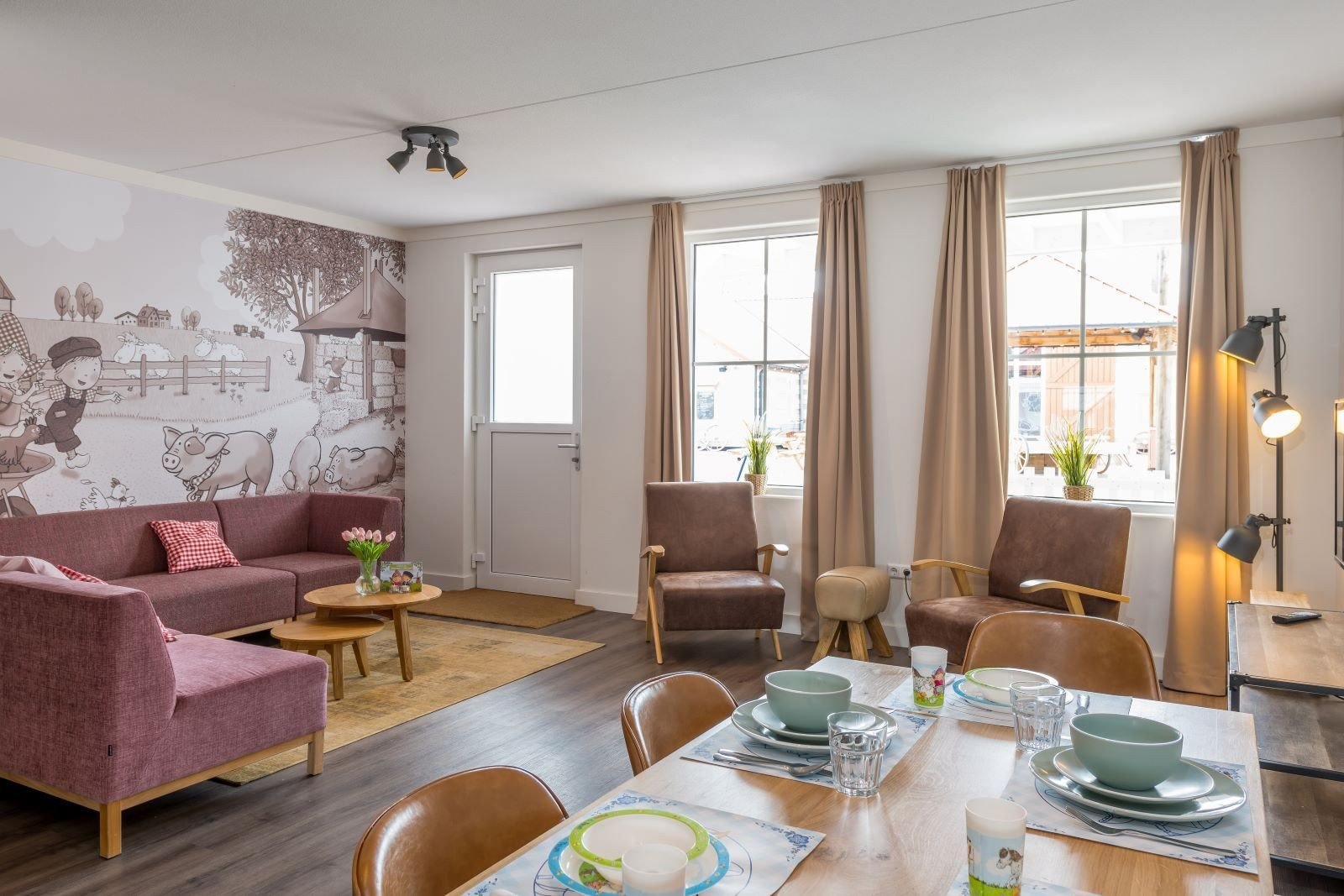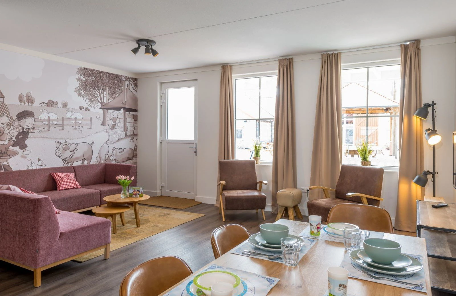 Family Resort Molenwaard has three themed accommodations for 8 people on Dorpsstraat. Step out the door and immediately find Speelschuur Molenwaard, the Frieterie and the IJskuipje. Or plop down on the covered terrace overlooking the fountain square. The youngest guests can play for hours and enjoy all the entertainment just a stone's throw away.